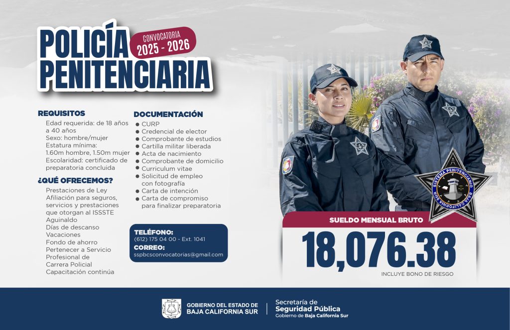 Las convocatorias cerrarán una vez que sean ocupadas las plazas vacantes, por lo que interesados pueden acudir a entrevista con la siguiente documentación: solicitud de empleo, copia de INE, CURP, acta de nacimiento, curriculum vitae, cartilla militar, certificado de estudios y comprobante de domicilio, en caso de no residir en la ciudad de La Paz pueden remitir sus documentos al correo sspbcsconvocatorias@gmail.com.